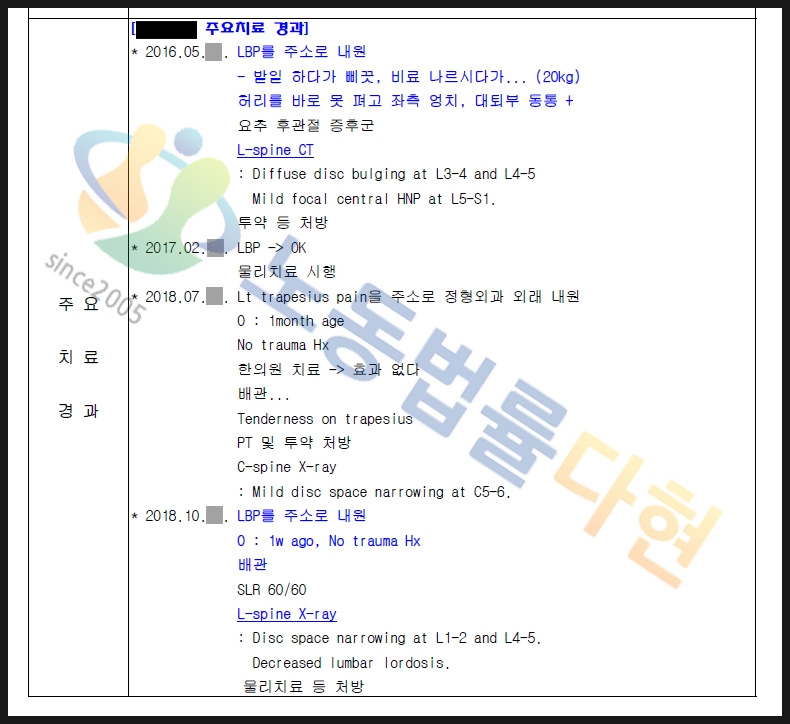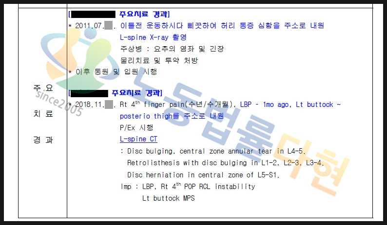 허리 부담업무를 하다 추간판탈출 진단을 받고, 개인적인 활동(운동, 밭일 등)으로 진료를 받은 기록이 있다면 작업환경, 의학조사, 허리부담요인 등 을 철저히 준비 하고 산재를 진행 하셔야 합니다.