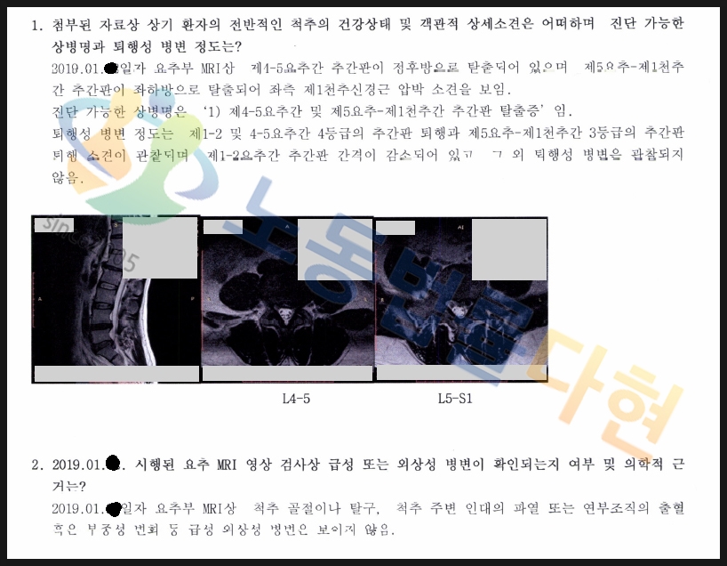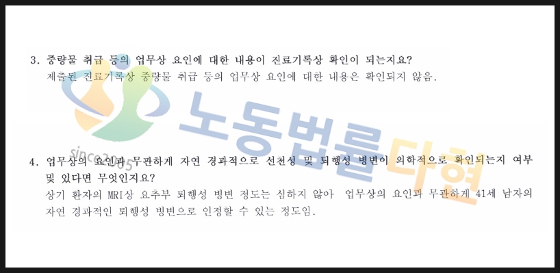 상기 환자의 MRI상 요추부 퇴행성 병변 정도는 심하지 않아 업무상의 요인과 무관하게 41세 남자의 자연경과적인 퇴행성 병변으로 인정할 수 있는 정도임.