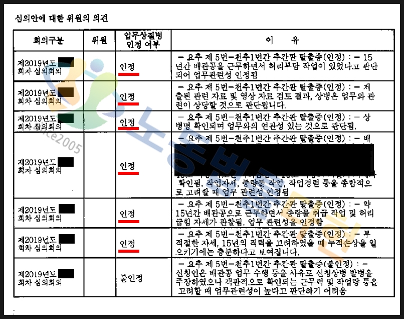 | 개인적인 부상(밭일, 운동)이 있음에도 불구하고, 추간판 탈출증 업무상 재해로 인정받은 사건. |